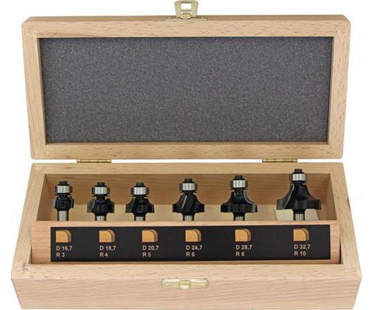 Inhalt: je 1 St. Abrundfräser 18,7 mm Ø - r = 3 mm 20,7 mm Ø - r = 4 mm 22,7 mm Ø - r = 5 mm 24,7 mm Ø - r = 6 mm 28,7 mm Ø - r = 8 mm 32,7 mm Ø - r = 10 mm Lieferung im HolzkastenTechnische Daten