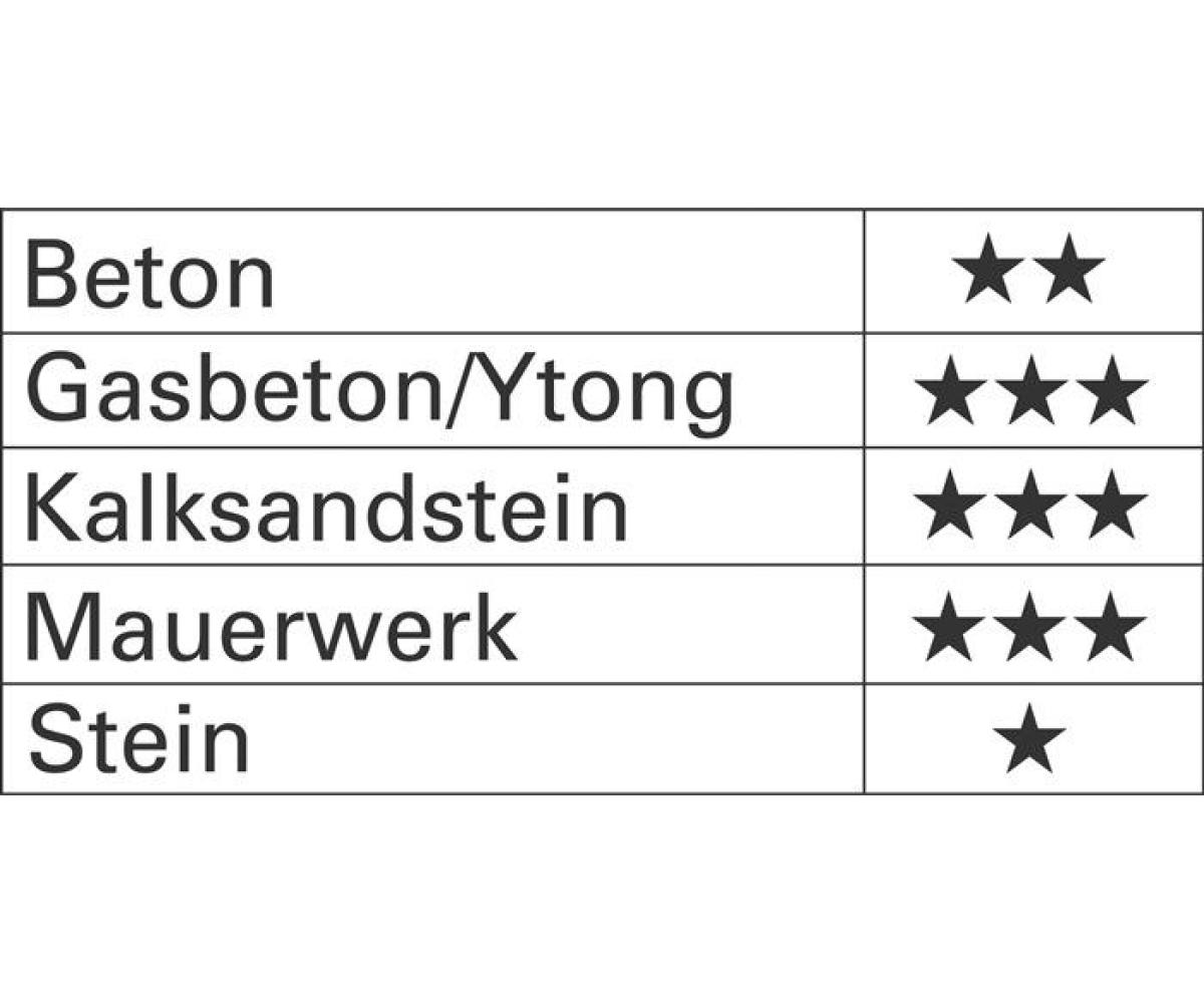 SDS-plus · effektiver Bohrmehlabtransport durch aggressive Spitzen- und Wendel-Ausführung · zertifiziert durch die Prüfgemeinschaft Mauerbohrer (PGM) nach Anforderungen des Deutschen Instituts für Bautechnik (DIBt) Anwendungsbereiche: Beton, Kalksandstein, Mauerwerk (für alle Beton- und Steinanwendungen)