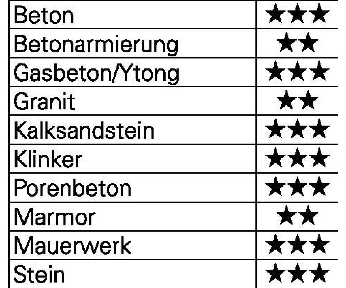 Anwendungsbereiche: Beton, armierter Beton, Stein, Kalksandstein, Mauerwerk, Marmor und Klinker ·