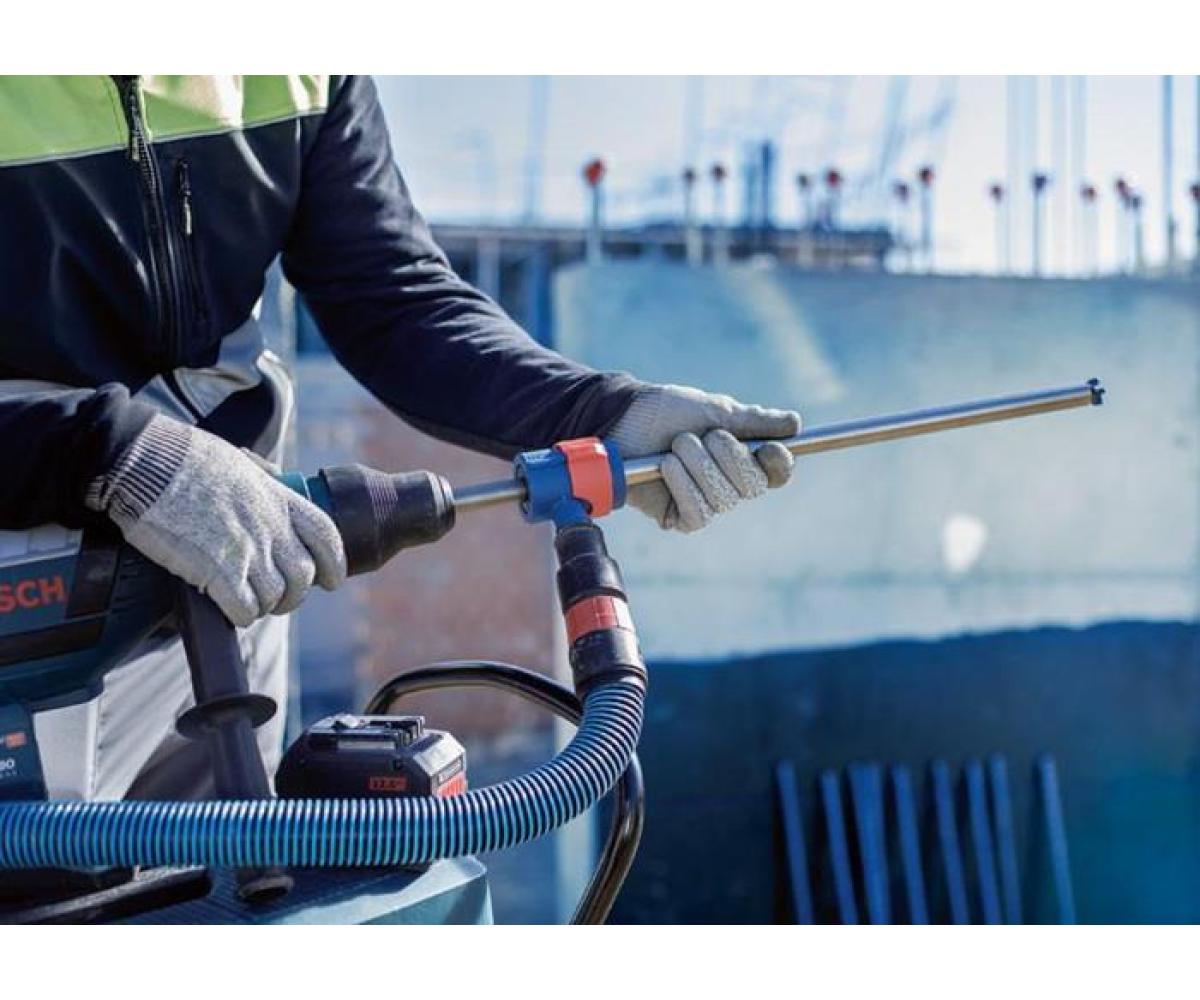 Bohren in Stahlbeton mit verbesserter Staubreduzierung! Durchdringt Stahlbeton mit einem Voll-Carbide-Kopf mit 4 Schneidern Installateure und Bauarbeiter wissen nur zu gut · dass beim Bohren in Beton große Mengen an Staub anfallen. Besonders unangenehm ist dies beim Bohren über Kopf oder beim Bohren und Reinigen für chemische oder mechanische Dübel. Für diese anspruchsvollen Arbeiten haben wir das EXPERT SDS Clean plus-8X Set entwickelt. Mit diesem Set bohrst und entfernst du gleichzeitig Staub und Bohrmehl · sodass mühsame Reinigungsarbeiten entfallen. Mit EXPERT SDS Clean plus-8X Set wird der Staub beseitigt · wenn du über Kopf oder eine ganze Reihe von Löchern für mechanische oder chemische Dübel bohren musst. Der Bohrer ist mit einem Vollhartmetallkopf mit 4 Schneiden und innenliegendem Absaugkanal ausgestattet. Zudem haben wir den SDS Clean plus Anschluss verbaut · der für alle SDS Clean plus-8X Bohrer geeignet ist und sich leicht montieren und abnehmen lässt. Er verbindet die Bohrmaschine mit Staubabsaugungen · sodass Staub und kleines Bohrgut durch den integrierten Absaugkanal aus dem Bohrloch extrahiert werden kann. Die vormontierte Staubkappe unterstützt das Auffangen von Schmutz und Staub · sobald du mit dem Bohren beginnst. Hocheffizienter Abtransport von Staub mit Bosch Particle Control