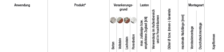 | * Die genannte Produktempfehlung kann nur unverbindlich sein. Die Befestigungselemente müssen jeweils den örtlichen Verhältnissen und den verwendeten Materialien im Einzelfall angepasst werde. |