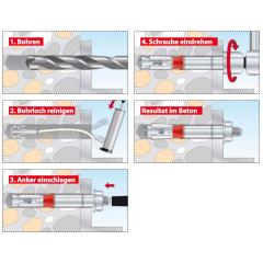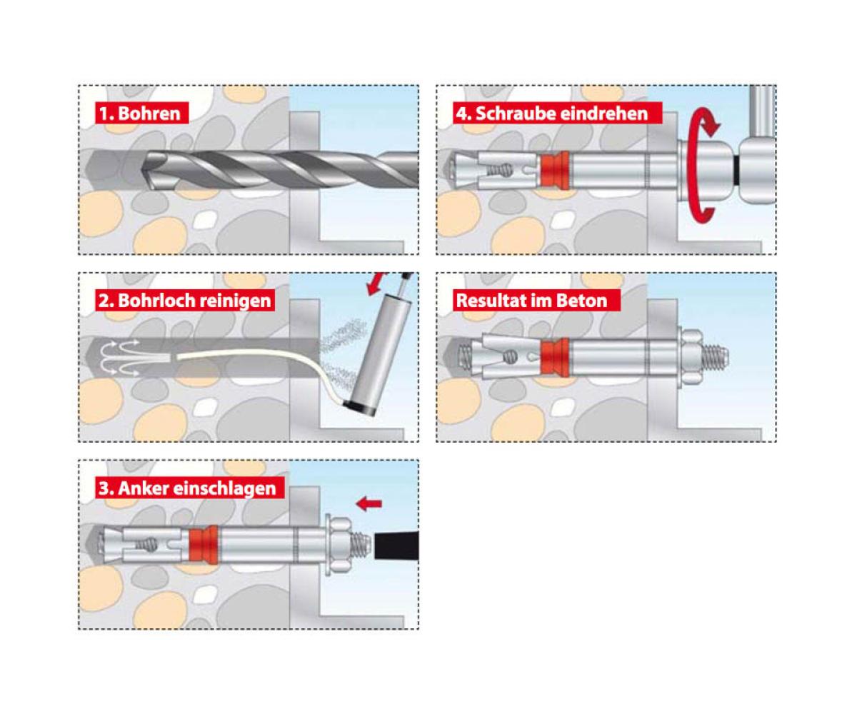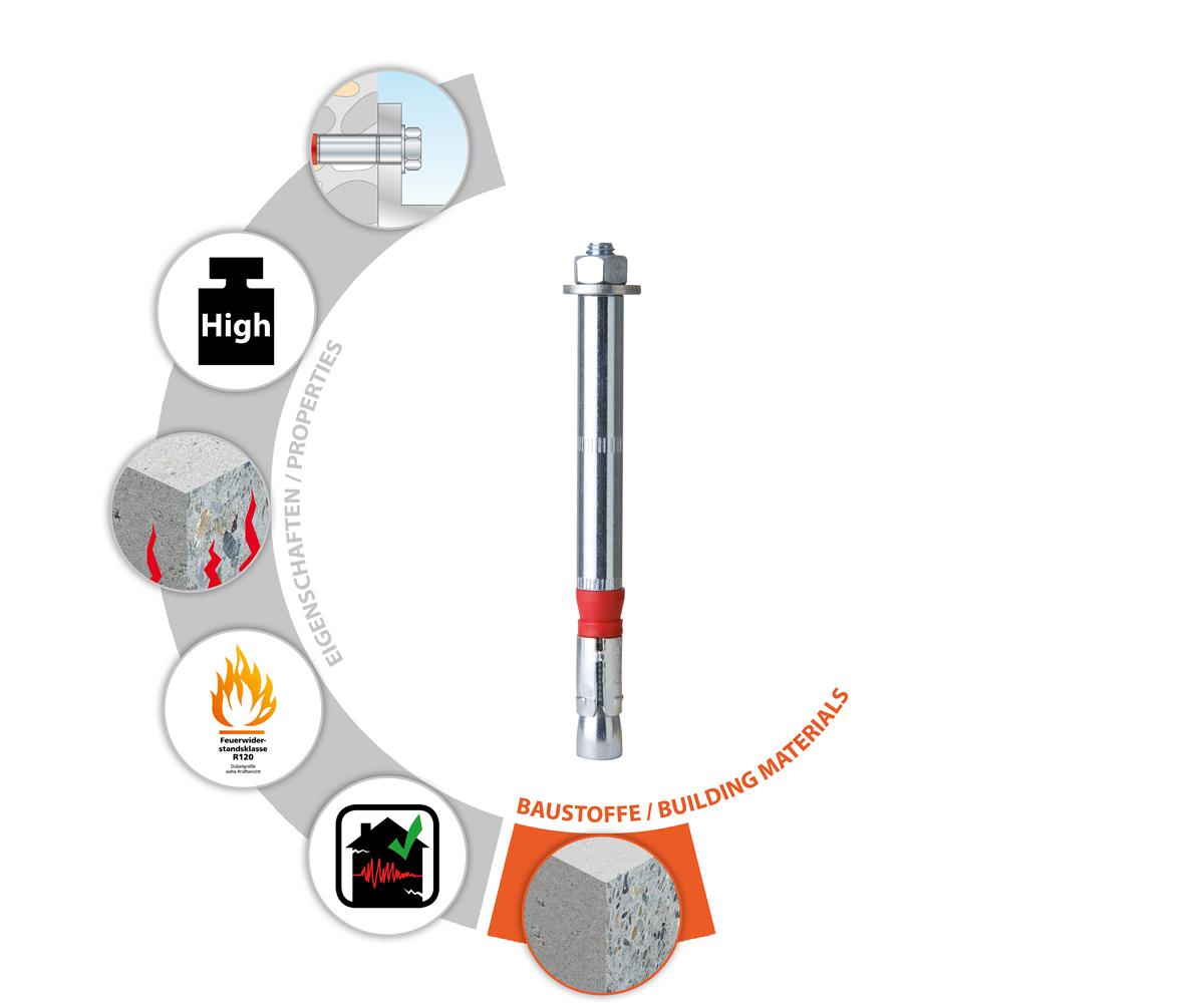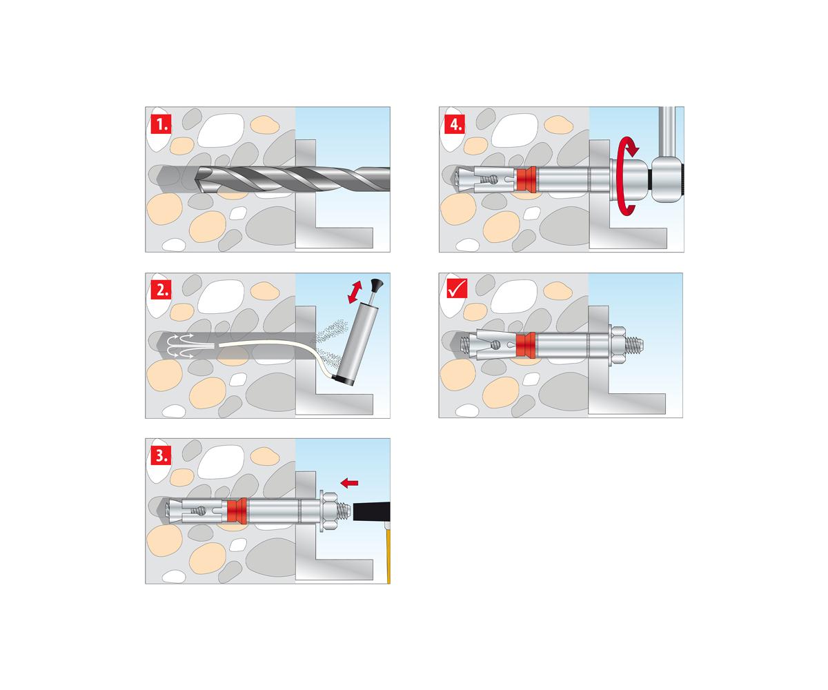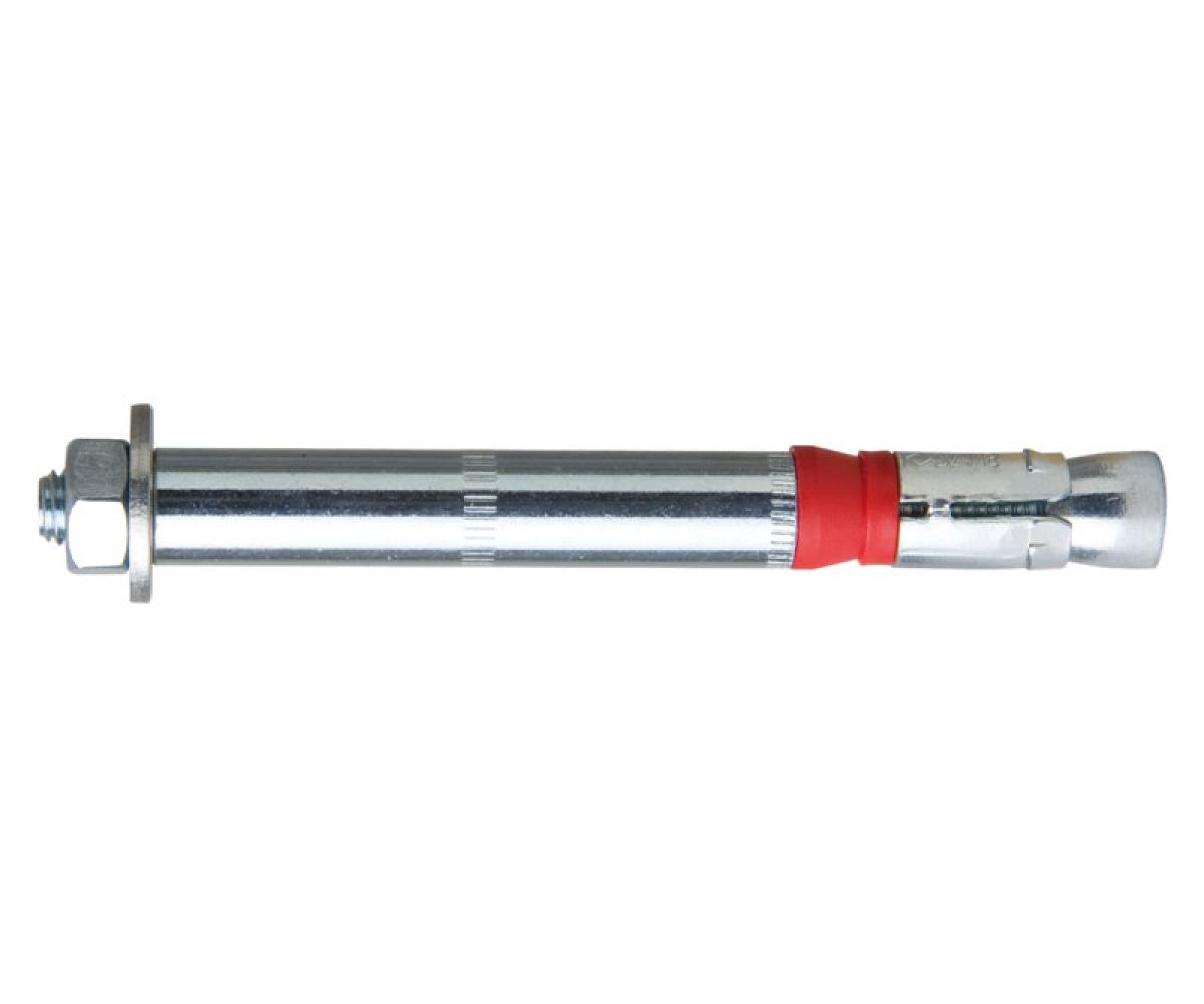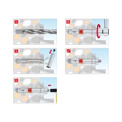 - The red plastic ring balances cavities, ensures lasting interlocking of the fixing part and prevents the anchor from rotating during installation