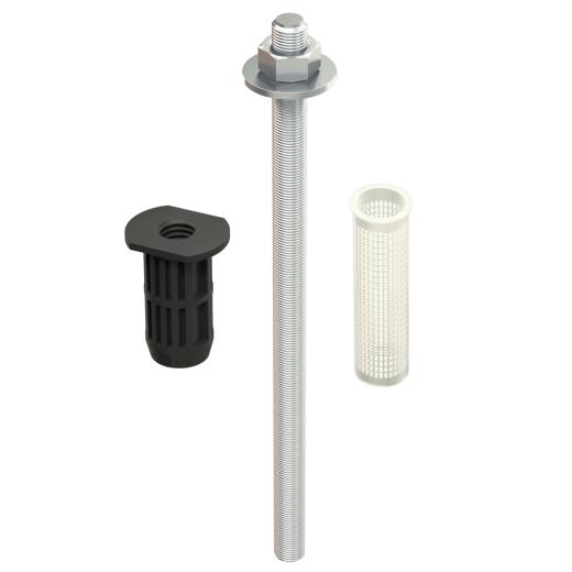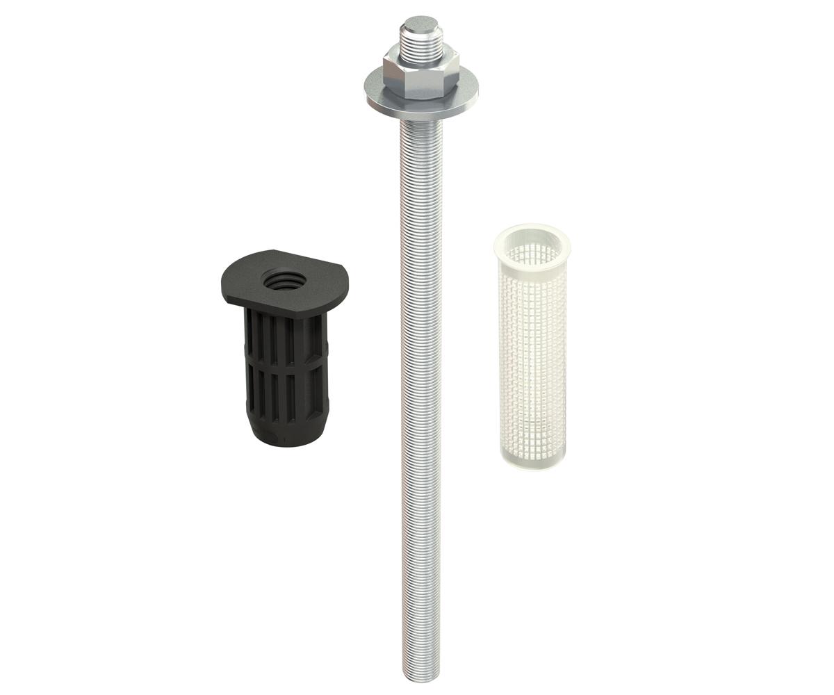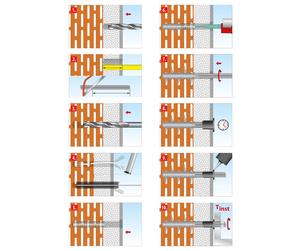 - Fill the drill hole in the substrate up to 2/3 full with injection mortar or fill the perforated sleeve fully