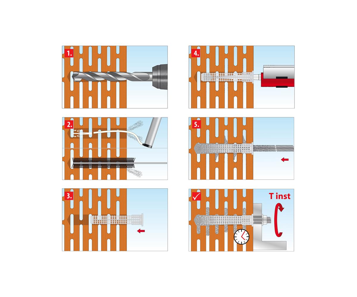 - Gereinigtes Bohrloch vom Bohrlochgrund her ca. zu 2/3 bzw. bei Verwendung einer Siebhülse diese komplett mit Verbundmörtel befüllen