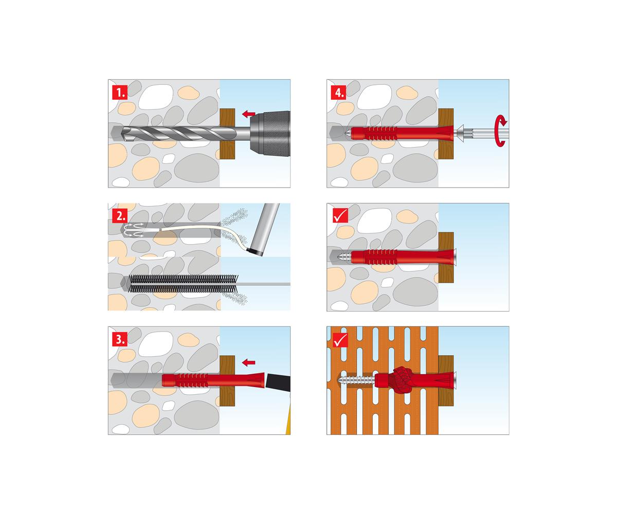 - Montagevoorwerp wordt door de plugconstructie naar de muur toegetrokken