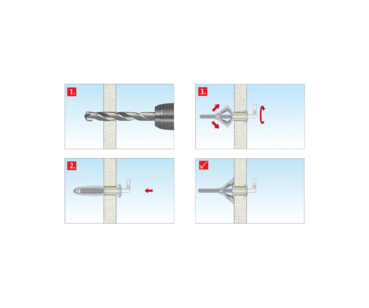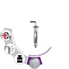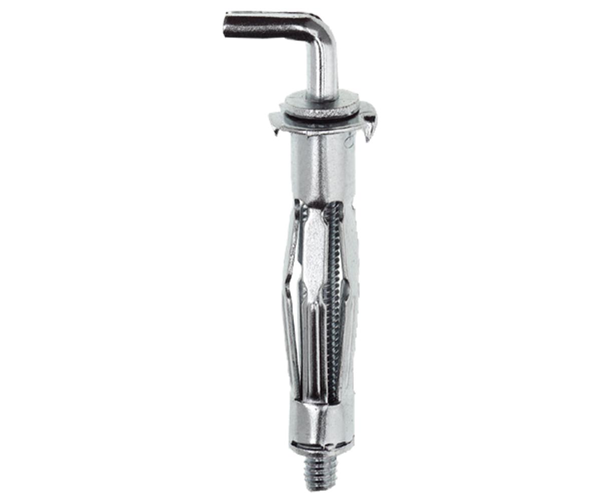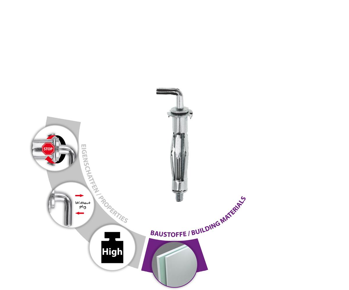 - Galvanisch verzinkter Metallhohlraumdu?bel mit Dübelkappe, Drehsicherungen und metrischer Hakenschraube