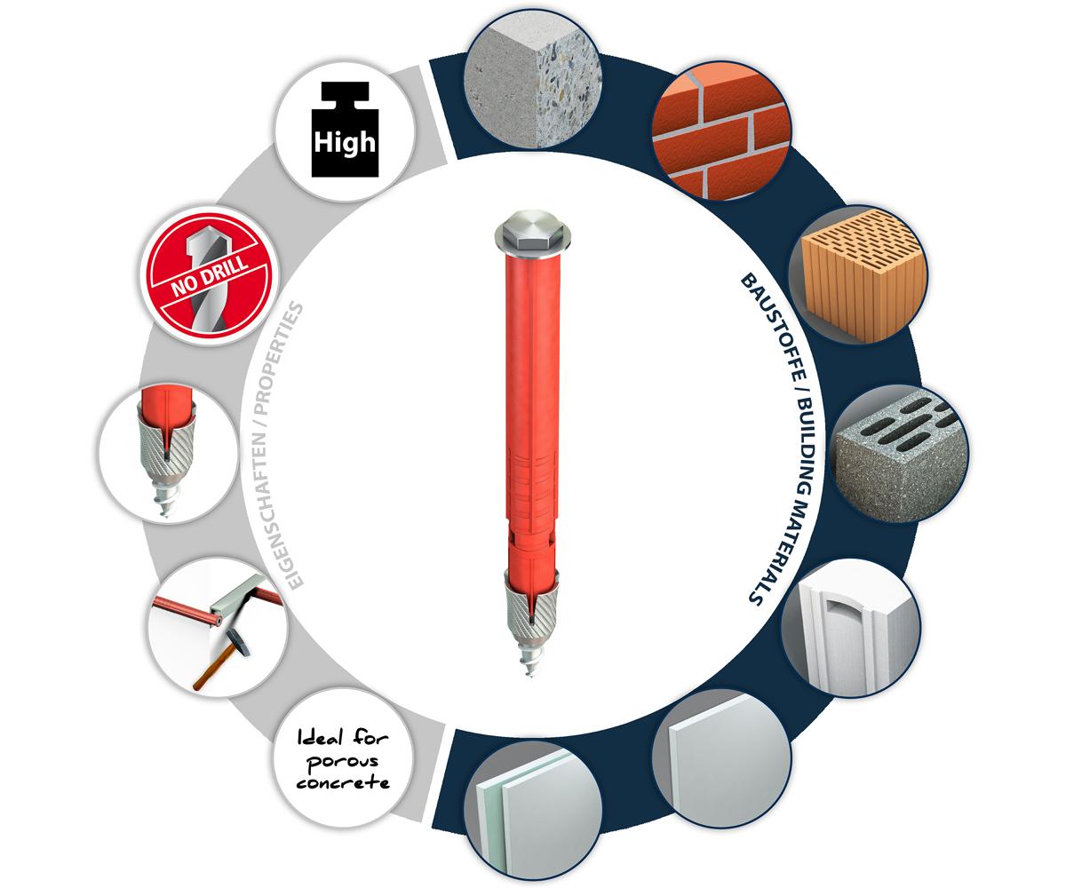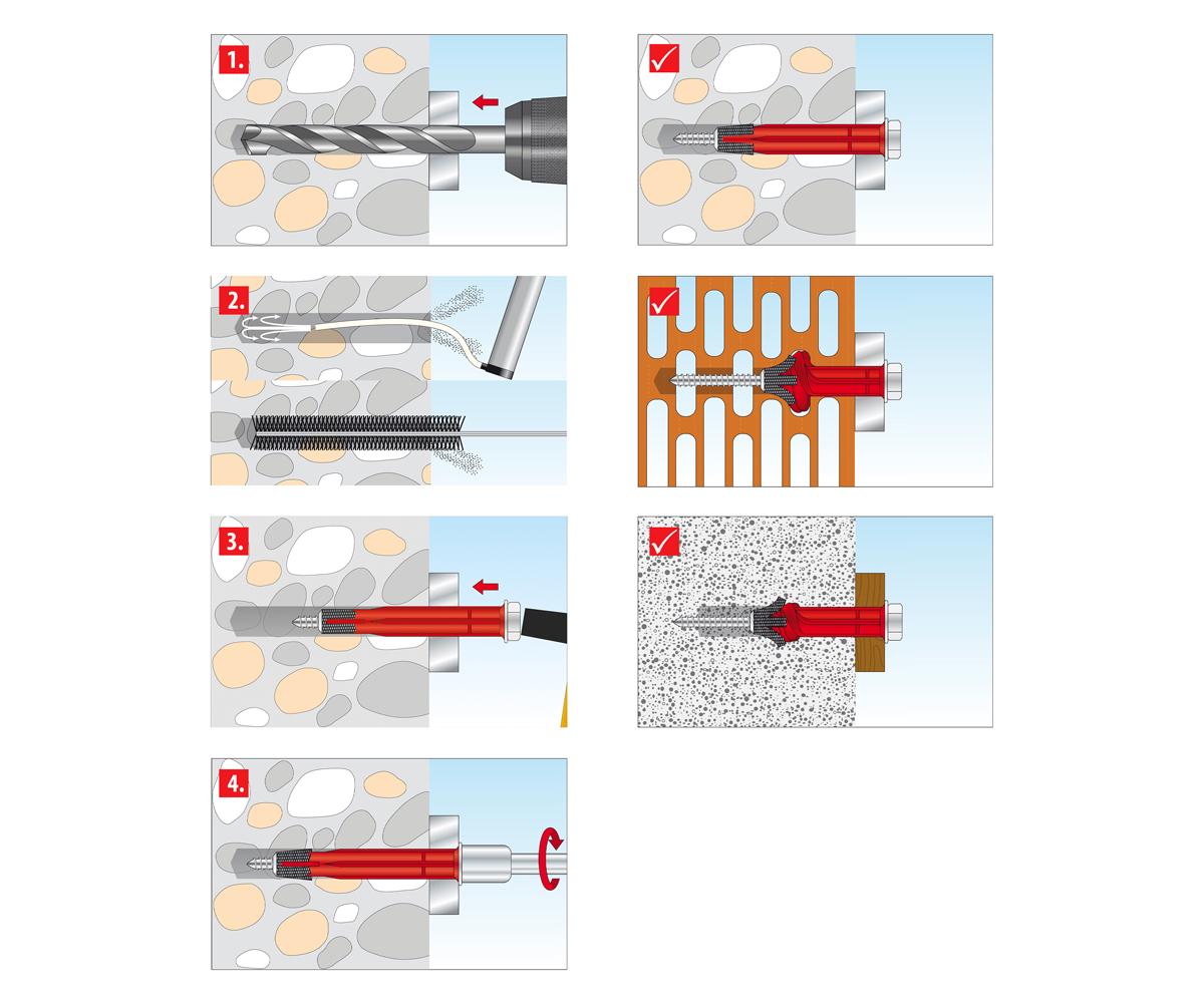 • Fixation sûre dans le béton et la brique pleine grâce à l’expansion