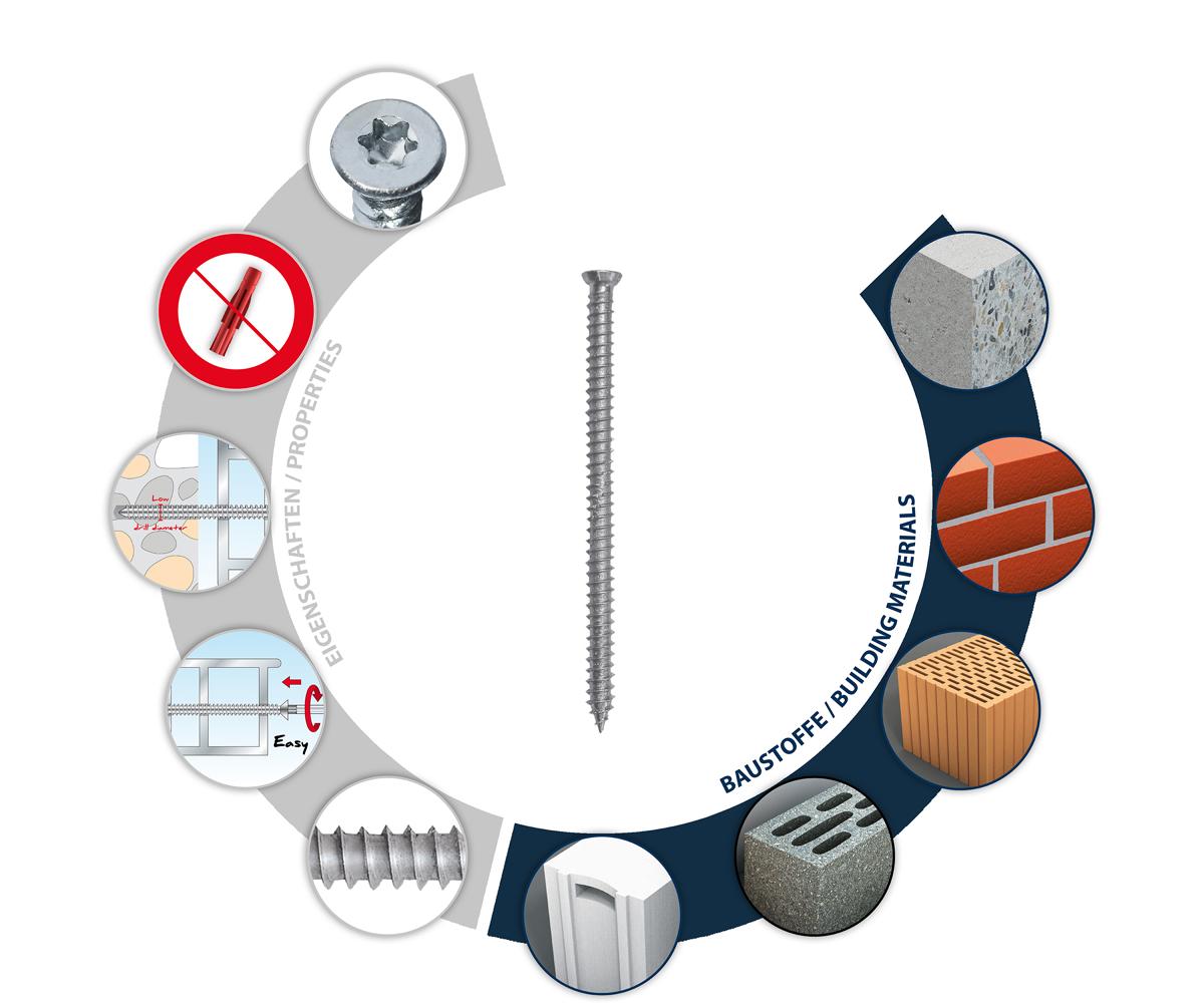 - Spannungsfreie Abstandsmontage durch Gewinde-Eingriff im Rahmen und Baustoff