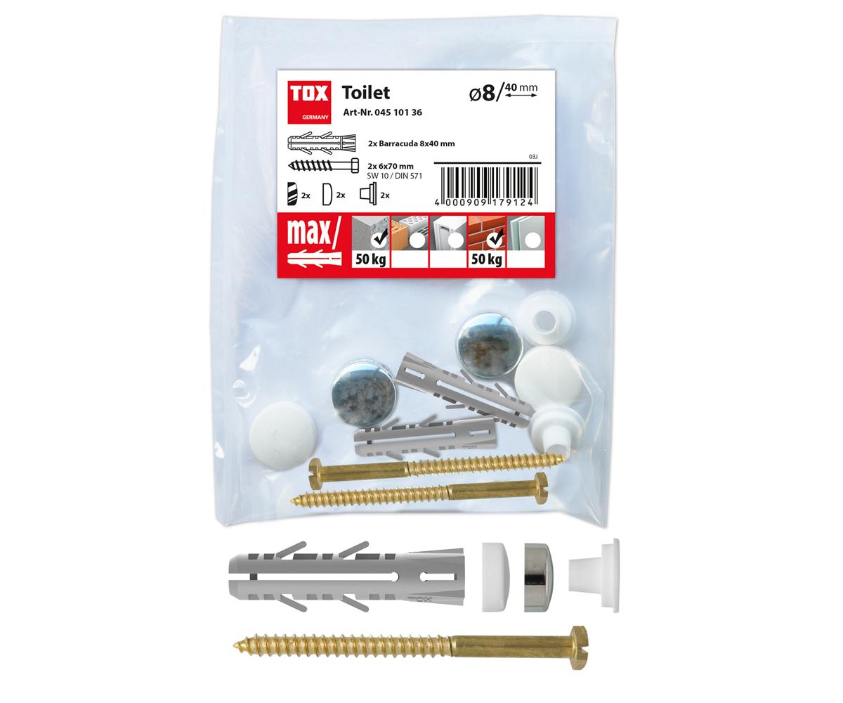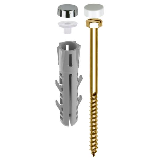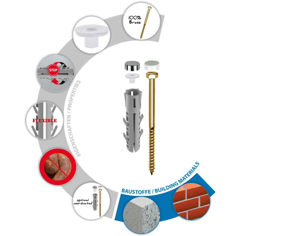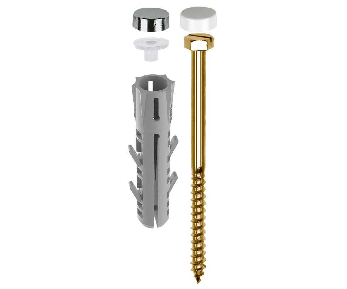 - Dos tacos de expansión Barracuda (8/40), dos arandelas de plástico con cuello, tornillo hexagonal de latón (SW 10) y tapas blancas y/o cromadas