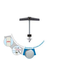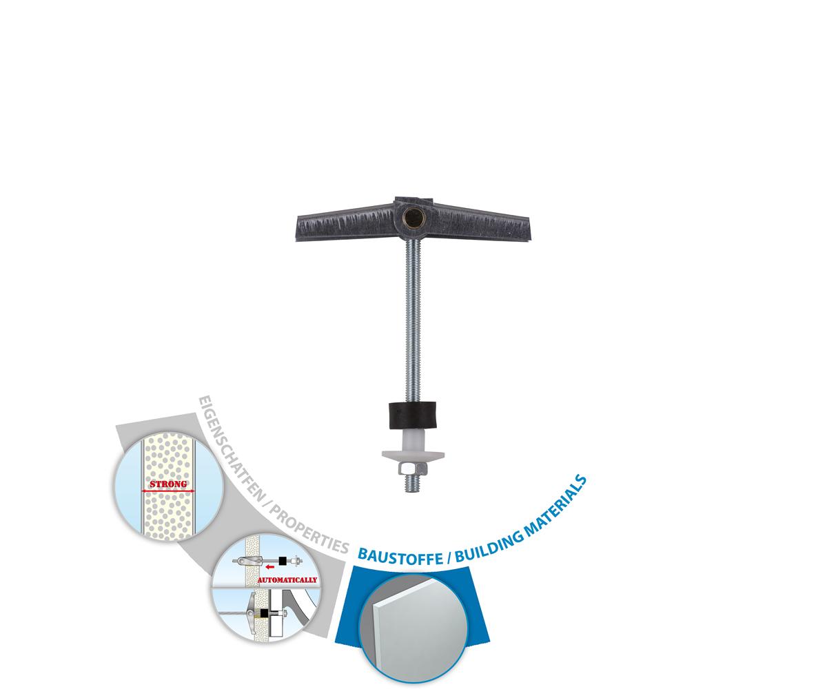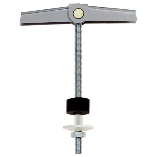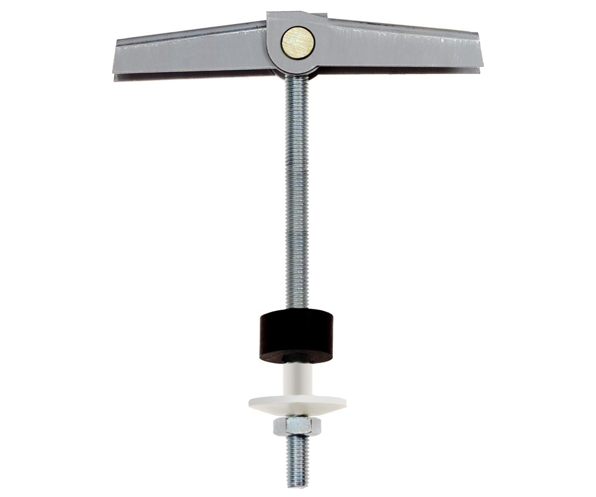• Taco metálico galvanizado galvánico con dos hojas y mecanismo de plegado por resorte, disco de apoyo de goma, disco con cuello de plástico, tuerca hexagonal (SW 17) y varilla roscada M10