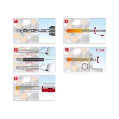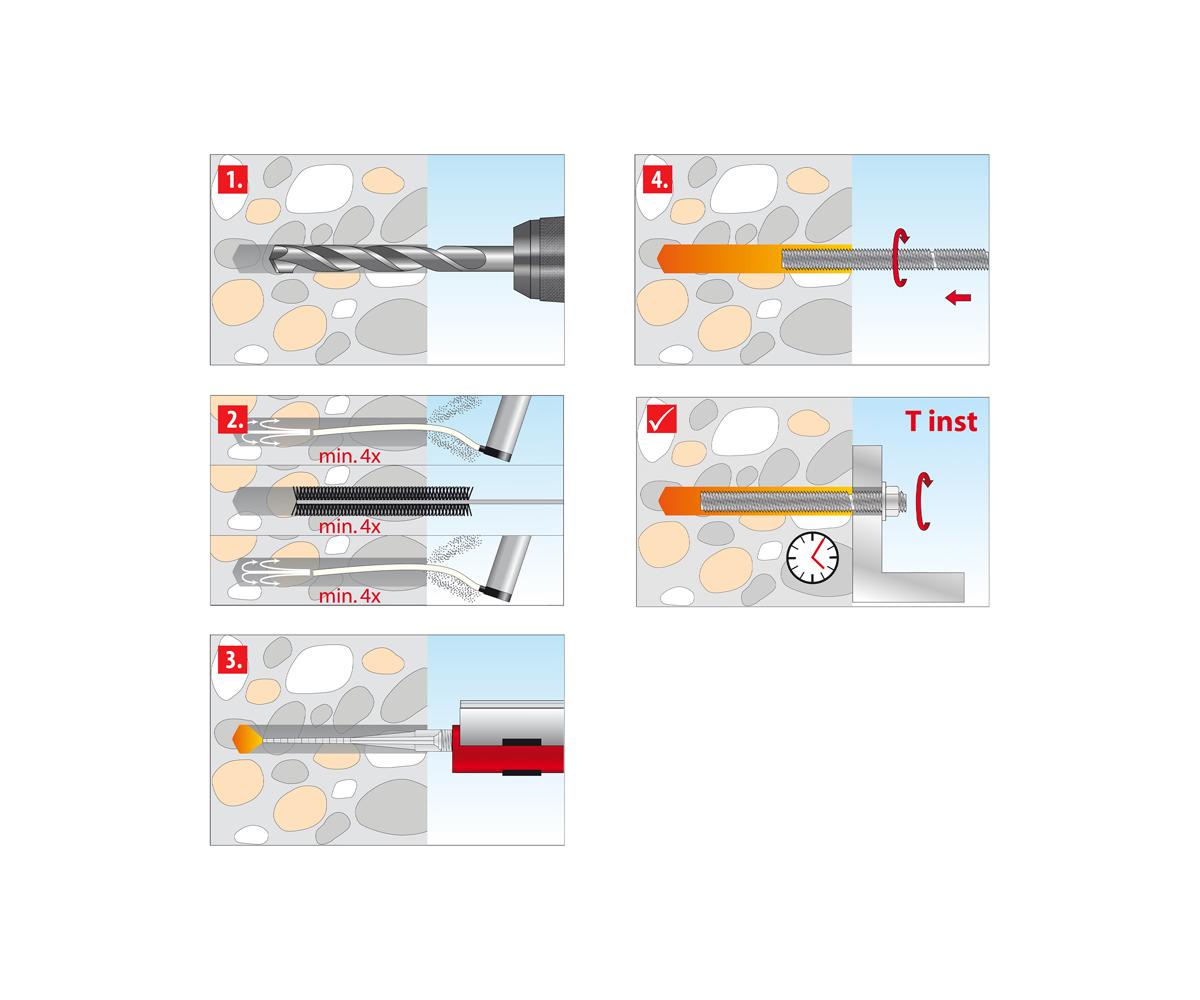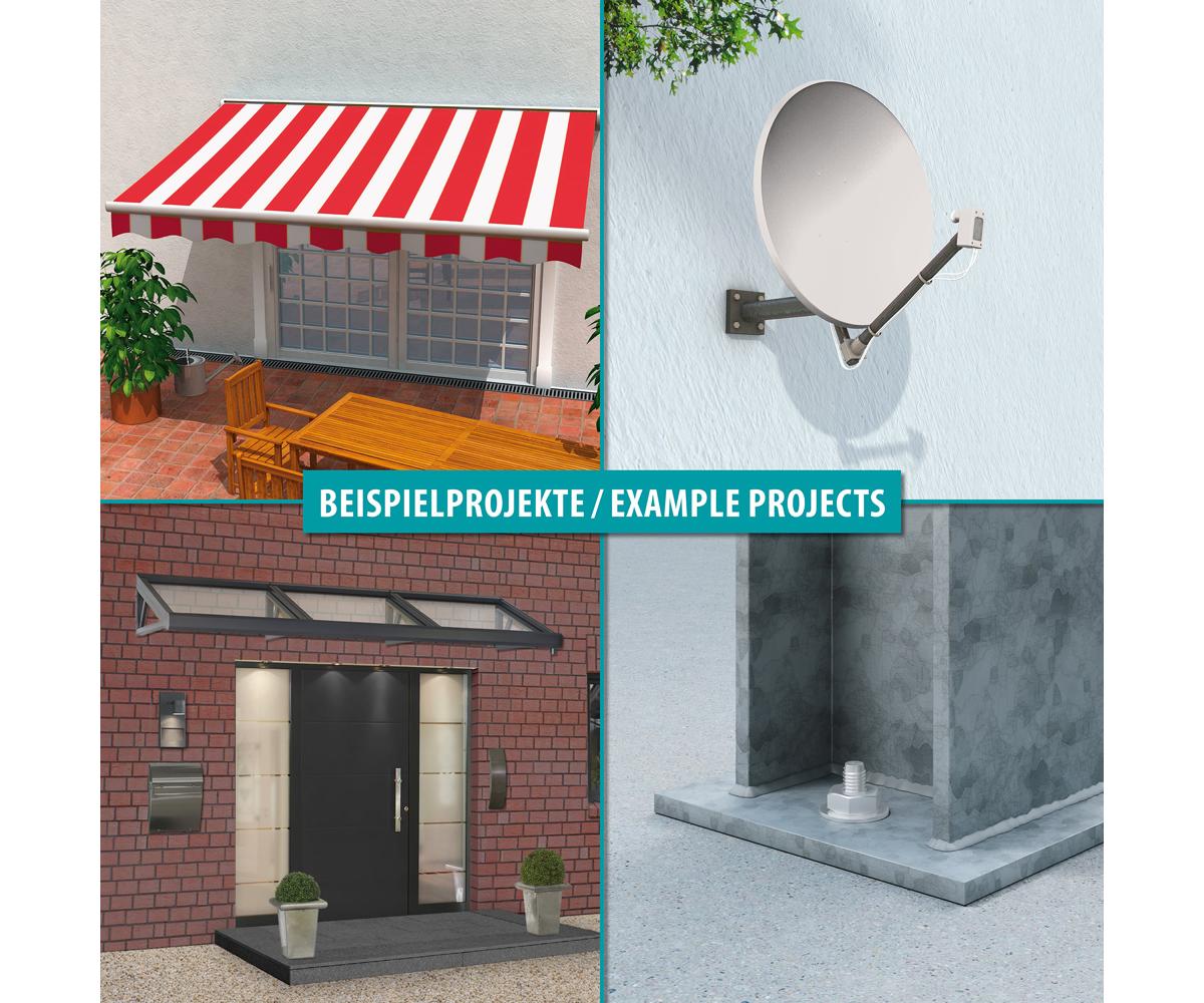 - De acero galvanizado (Stix-VZ) o acero inoxidable (Stix-A4) con hexágono interior, marca de profundidad de ajuste, punta para techo, tuerca hexagonal, arandela y herramienta de ajuste
