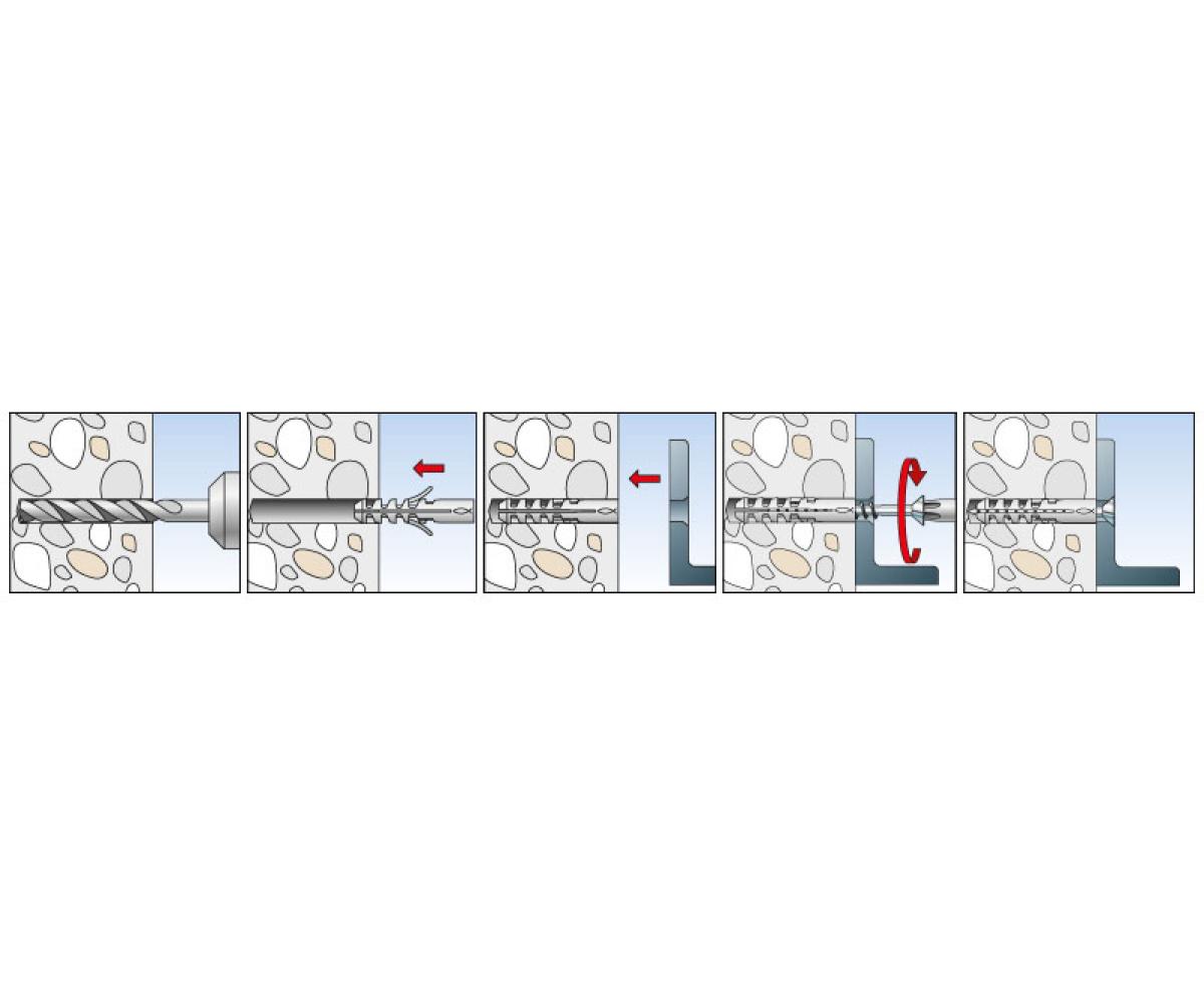 Kombination aus zwei Materialkomponenten für mehr Leistung • Sichere Funktionen für Voll- (Spreizen) und Loch- und Plattenbaustoffe (Klappen/Knoten) • Einfache Montage: schmaler Dübelrand verhindert das Tieferrutschen ins Bohrloch