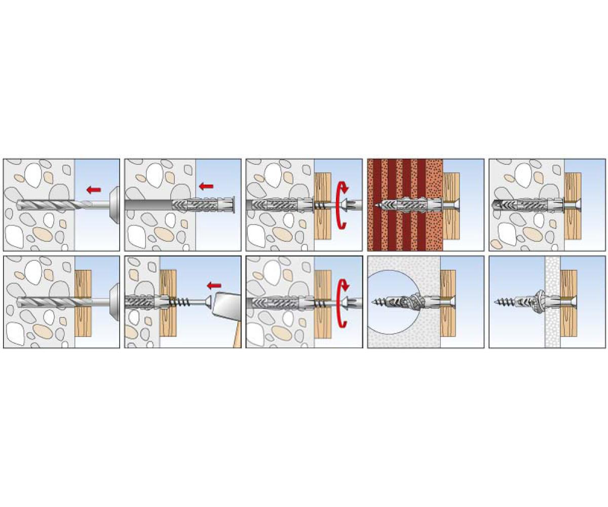 • Béton, plaques de plâtre et de fibres, briques creuses, blocs creux en béton léger, plafonds creux en brique et en béton, Brique creuse en sable calcaire, brique pleine en sable calcaire, pierre naturelle, béton cellulaire, panneaux de particules, plaques de plâtre pleines, brique pleine en béton léger, brique pleine