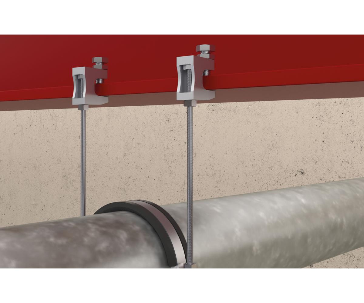 Die fischer Trägerklammer mit Durchgangsbohrung für ein einfaches Befestigen durch Klemmen an Stahlträgern. Für VdS-Anlagen sind ab DN 65 Sicherungslaschen erforderlich. Der Hohlschliff der Befestigungsschraube verhindert wirksam das Abrutschen vom Stahlträger.
