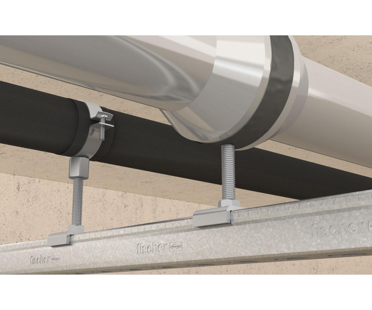 Die fischer Kälteschelle KFT aus geschlossenem PUR-Schaum ist eine Rohrschelle mit Dreifach-Anschlussgewinde M 8/M 10 und ½“. Die Ausführung mit zwei Schrauben ermöglicht die optimierte Anpassung an den Rohraußendurchmesser. Zusammen mit dem Dreifach-Anschlussgewinde erhöht dies die Flexibilität. Die eingeklebte Kautschukauflage reduziert zusätzlich den Montageaufwand. Damit können Rohrleitungen für die Kälte- und Klimatechnik mit einem Außendurchmesser von 12 - 219 mm und einer Dämmdicke bis 40 mm mit Gewindestange oder Stockschraube im Innenbereich sicher befestigt werden. Das altersbeständige Dämmmaterial sichert die optimale Funktion der Kälteschelle.