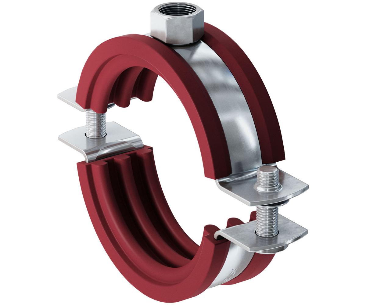 Die fischer Rohrschelle FRSH ist eine zweischraubige Rohrschelle aus galvanisch verzinktem Stahl der Werkstoffgüte DD11 mit einer hochtemperaturbeständigen Silikon-Schalldämmeinlage. Die Ausführung mit zwei Schrauben ermöglicht die optimierte Anpassung an den Rohraußendurchmesser. Damit können Heißwasser- und Dampfleitungen mit Medien bis +220 °C und einem Außendurchmesser von 15 - 168 mm mit Gewindestange oder Stockschraube im Innenbereich sicher befestigt werden. Die Rohrschelle entspricht mit einer chlorfreien Schalldämmeinlage den Anforderungen der DIN 4109.