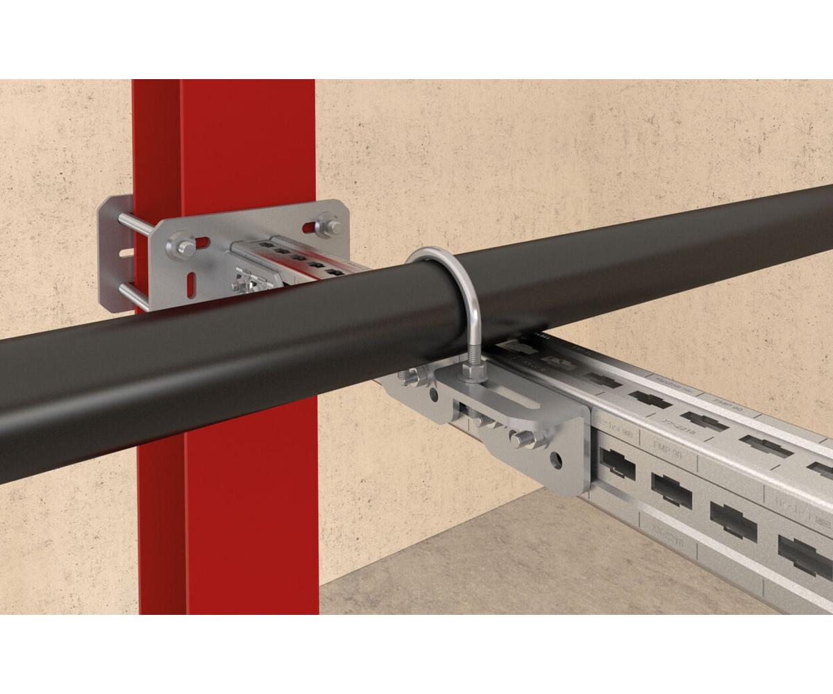 • Der massive Rohrbügel FMPSU zur Fixierung von schweren Rohrleitungen direkt auf das Montageprofil FMP ist die einfachste Verbindungsart von schweren Rohrleitungen.