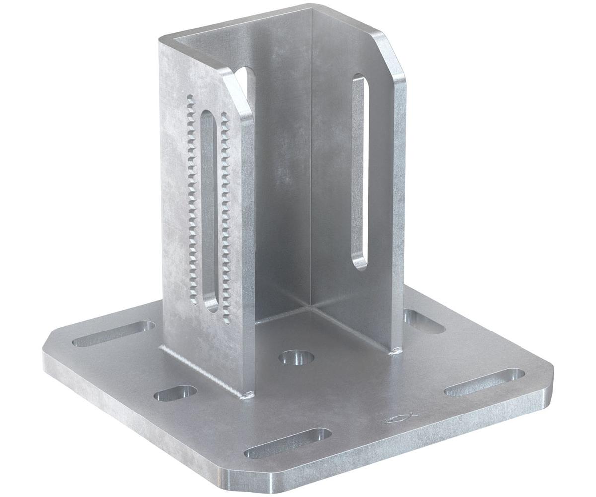 technische Zeichnungfischer Sattelflanschen sind optimale Verbindungselemente von Schiene zu Untergrund oder Stahlbau. Die Verbindung zum Montageprofil FMP erfolgt durchweg mit dem fischer Hammerkopf-Steckverbinder FMHB oder durch Trägerklammern und Anker zum Untergrund. Die Ausführung in Feuerverzinkung mit hoher Schichtdicke eignet sich für die Installationen im Freien und in korrosiver Umgebung.