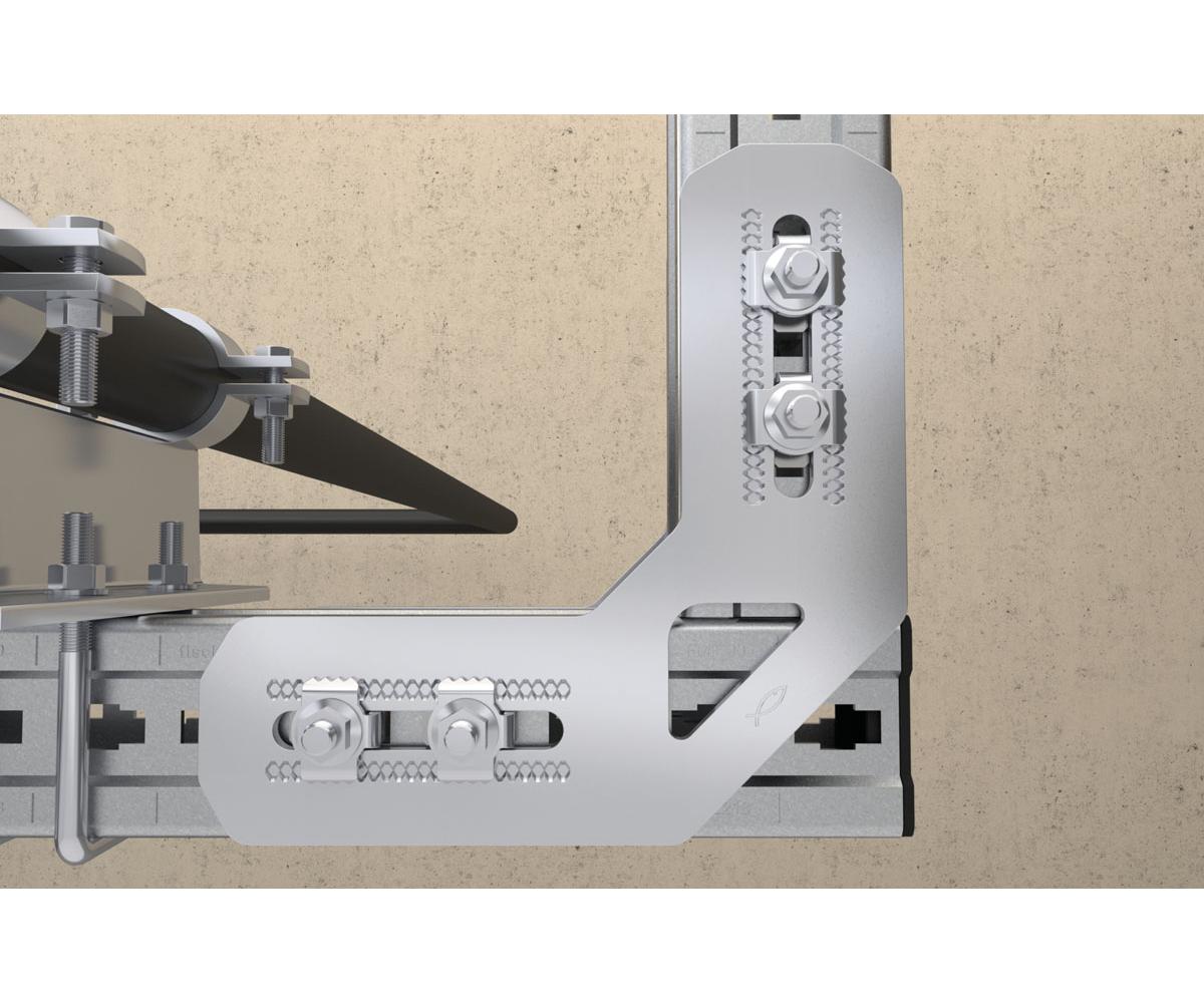 Die fischer Verbindungselemente des fischer Massiven Schienensystems FMS ermöglichen eine schnelle und einfache Verbindung an das Montageprofil FMP. Der fischer Hammerkopf-Steckverbinder FMHB eignet sich als vorgefertigter Verbinder zur Befestigung der Konstruktionselemente. Eine sichere Verbindung von Gewindestangen, Rohrschellen oder Grundplatten schaffen die Verbindungselemente FMCE und FMCE-L. Das Verbindungselement FMCE-L ermöglicht mittels Langlöchern flexible Verbindungen für unterschiedliche Elemente wie Grundplatten oder U-Bügel. Die Ausführung in Feuerverzinkung mit hoher Schichtdicke eignet sich für die Installationen im Freien und in korrosiver Umgebung.