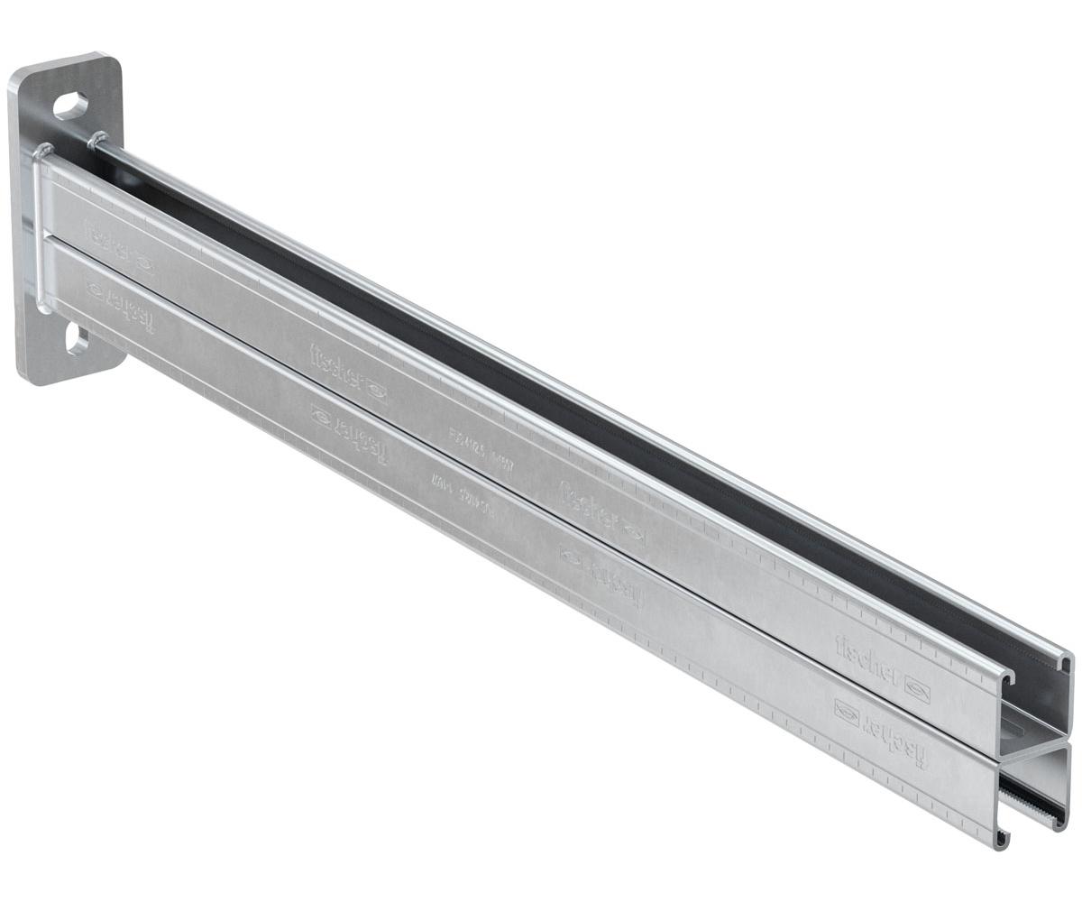 Die Auslegerkonsole FCA ist als zweites Basiselement des Schienensystems FUS für die Befestigung von Installationen wie Rohrtrassen entlang der Wand geeignet. Die Auslegerkonsole wird durch die um 90° zueinander gedrehten Langlöcher in der Grundplatte direkt am Untergrund befestigt. fischer bietet Standardlängen von 200 - 1000 mm, ein Ablängen ist somit nicht notwendig. Dies spart Zeit und Kosten. Die Ausführung mit galvanischer Verzinkung ist für Installationen in Gebäuden geeignet, die Versionen aus feuerverzinktem und nicht rostendem Stahl für die Installation im Freien und in hochkorrosiver Umgebung. Der Brandschutznachweis nach MLAR/EN13501 bietet ein Plus an Sicherheit.