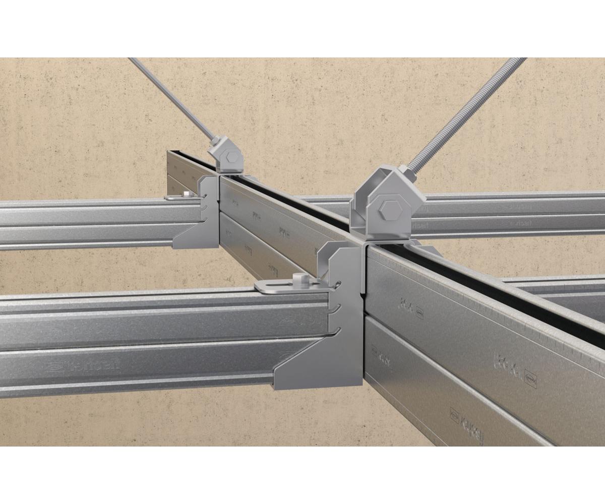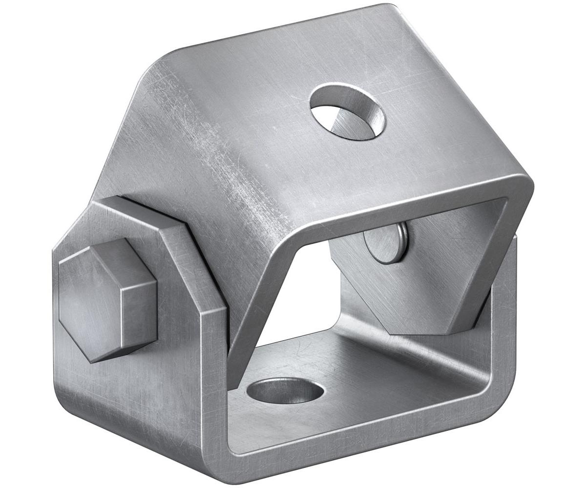 Das Universalgelenk FUH bietet vielfältige Anwendungsmöglichkeiten von der einfachen Abspannung mittels Gewindestangen zum Aussteifen von Schienensystemen oder zum Abhängen von Rohrleitungen an unebenen oder geneigten Untergründen.