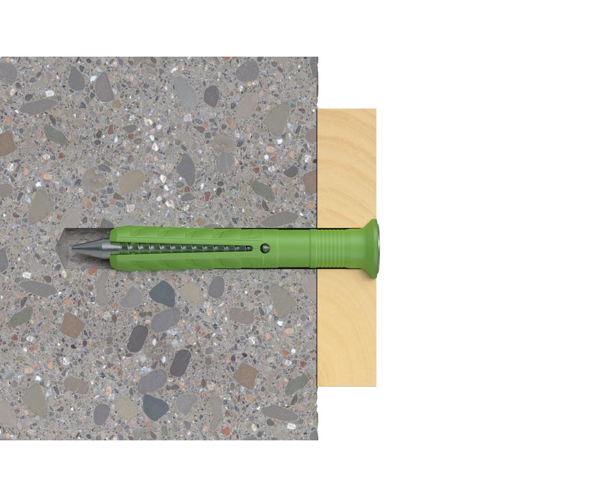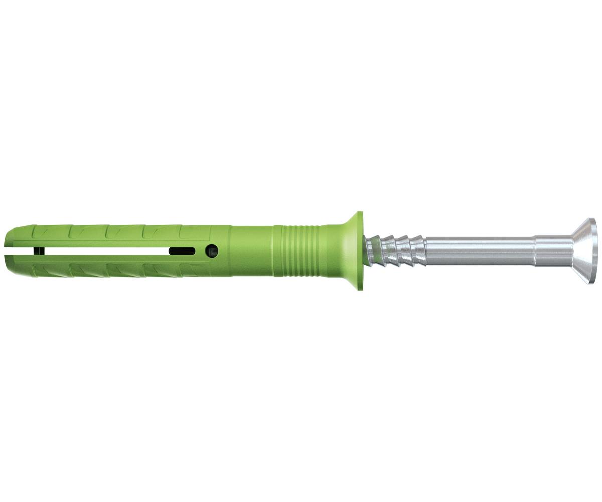 Der fischer Nageldübel N Green mit Senkkopf besteht aus einer Dübelhülse aus Kunststoff und einer galvanisch verzinkten Nagelschraube. Diese sind für eine schnelle Montage bereits vormontiert. Das Granulat zur Herstellung des fischer Nageldübels N Green wird mindestens zur Hälfte aus nachwachsenden Rohstoffen gewonnen. Diese stehen nicht in Konkurrenz zu Anbauflächen für Nahrungs- und Futtermittel. Der Nageldübel N Green verfügt über die gleichen Leistungsmerkmale und Tragfähigkeit wie das Original. Der Nageldübel wird in der zeitsparenden Durchsteckmontage durch das Anbauteil eingeführt. Beim Einschlagen der Nagelschraube spreizt die Dübelhülse auf und verankert sicher im Baustoff. Der fischer Nageldübel N Green mit Senkkopf ist ideal für die Befestigung von Holzkonstruktionen in allen Baustoffen im Innenbereich.
