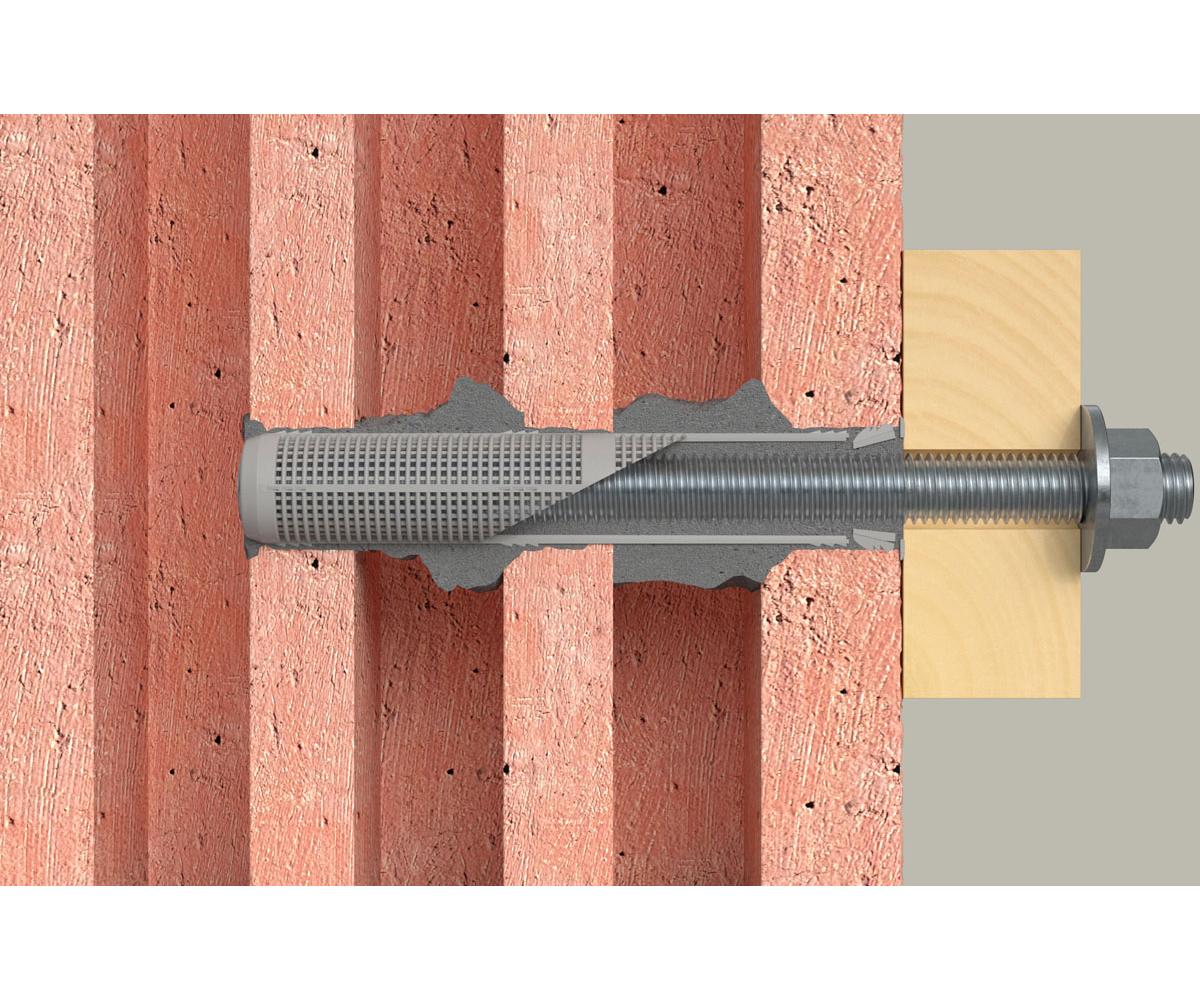 - Die Widerhaken halten die Ankerhülse fest im Bohrloch und ermöglichen so eine problemlose Überkopfmontage.