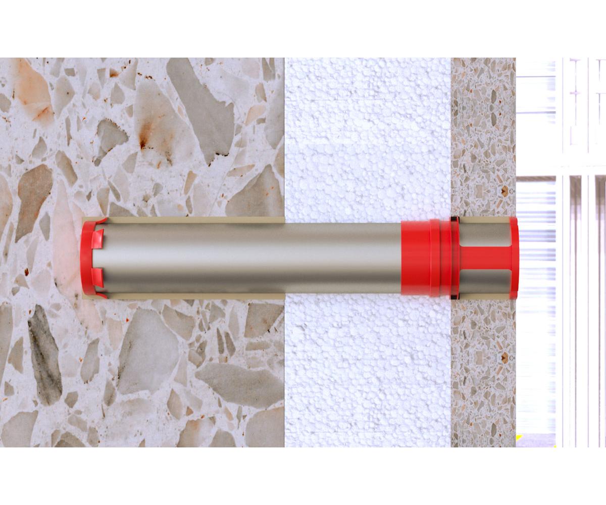 Der fischer Wetterschalen-Sanieranker FWS II ist ein System zur nachträglichen Sicherung von dreischichtigen Außenwandplatten aus Beton. Das System besteht aus dem Wetterschalen-Sanieranker FWS II aus nicht rostendem Stahl und dem fischer Hochleistungsmörtel FIS V. Der FWS II wird mit dem Injektionsmörtel in der Tragschicht in die Wetterschale eingemörtelt. Dabei schützt die Kunststoffummantelung die Dämmung vor dem Eindringen des Mörtels.