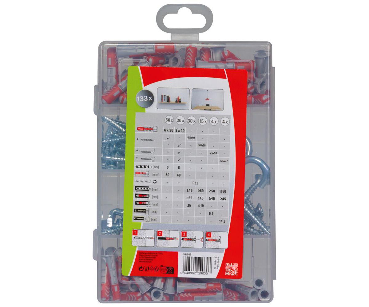 50 x DuoPower 6 x 30, 30 x DuoPower 8 x 40, 30 x Senkkopfschraube 4,5 x 40, 15 x Senkkopfschraube 5,0 x 55, 4 x Haken 5,5 x 58, 4 x Rundhaken 5,5 x 77