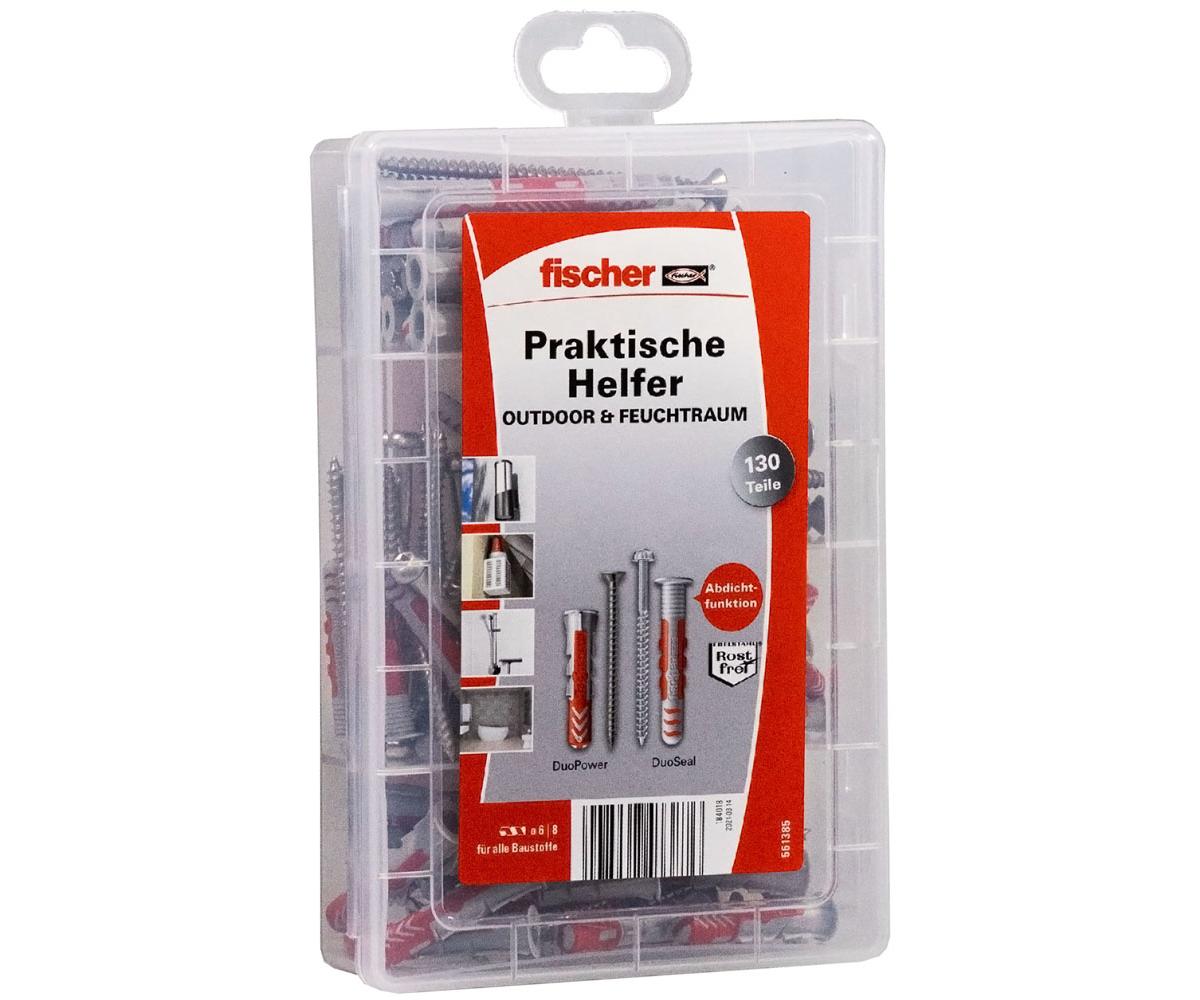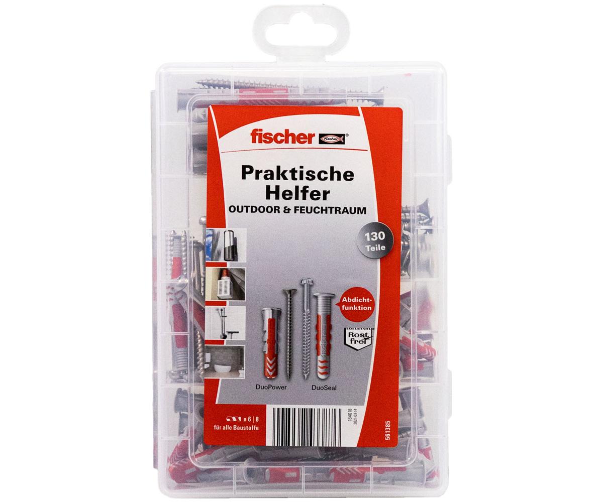 Die fischer Praktische Helfer Box Outdoor & Feuchtraum enthält vorsortiert 25 x DuoPower 6 x 30 und 25 x Senkkopfschrauben 4,5 x 40 in Edelstahl A2, 15 x DuoPower 8 x 40 und 15 x Senkkopfschrauben 5,0 x 55 in Edelstahl A2, 10 x DuoPower 8 x 65 und 10 x Senkkopfschrauben 5,0 x 80 in Edelstahl A2 sowie 15 x DuoSeal 6 x 38 und 15 x Panheadschrauben 4,5 x 60 in Edelstahl A2.