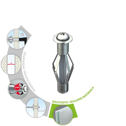 - Fissaggio a cavità metallica zincata galvanicamente con calotta, dispositivo anti-rotazione e vite metrica con esagono (SW 13) o azionamento con scanalatura e scanalatura a croce