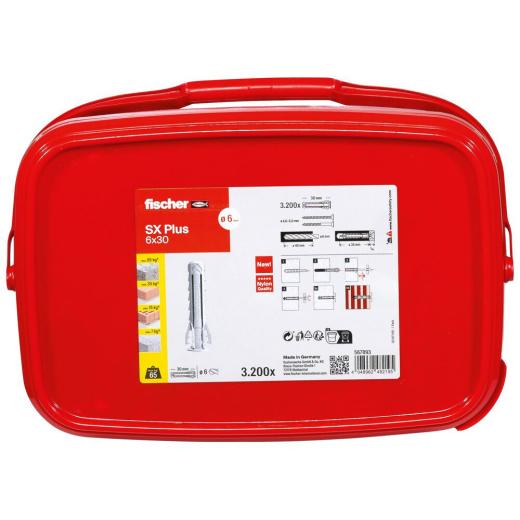 Die speziellen Fixierflügel des Spreizdübels SX Plus fixieren die Schraube bereits durch leichtes Einstecken. Sobald der Dübel in das Bohrloch gesteckt wird, werden die Fixierflügel nach innen gedrückt, wodurch die Schraube einrastet und festgehalten wird. Je nach Baustoff fixiert die eingesteckte Schraube auch leichte Anbauteile, dadurch sind beide Hände des Anwenders frei. Dies ist vor allem bei Überkopf-Anwendungen sehr hilfreich.